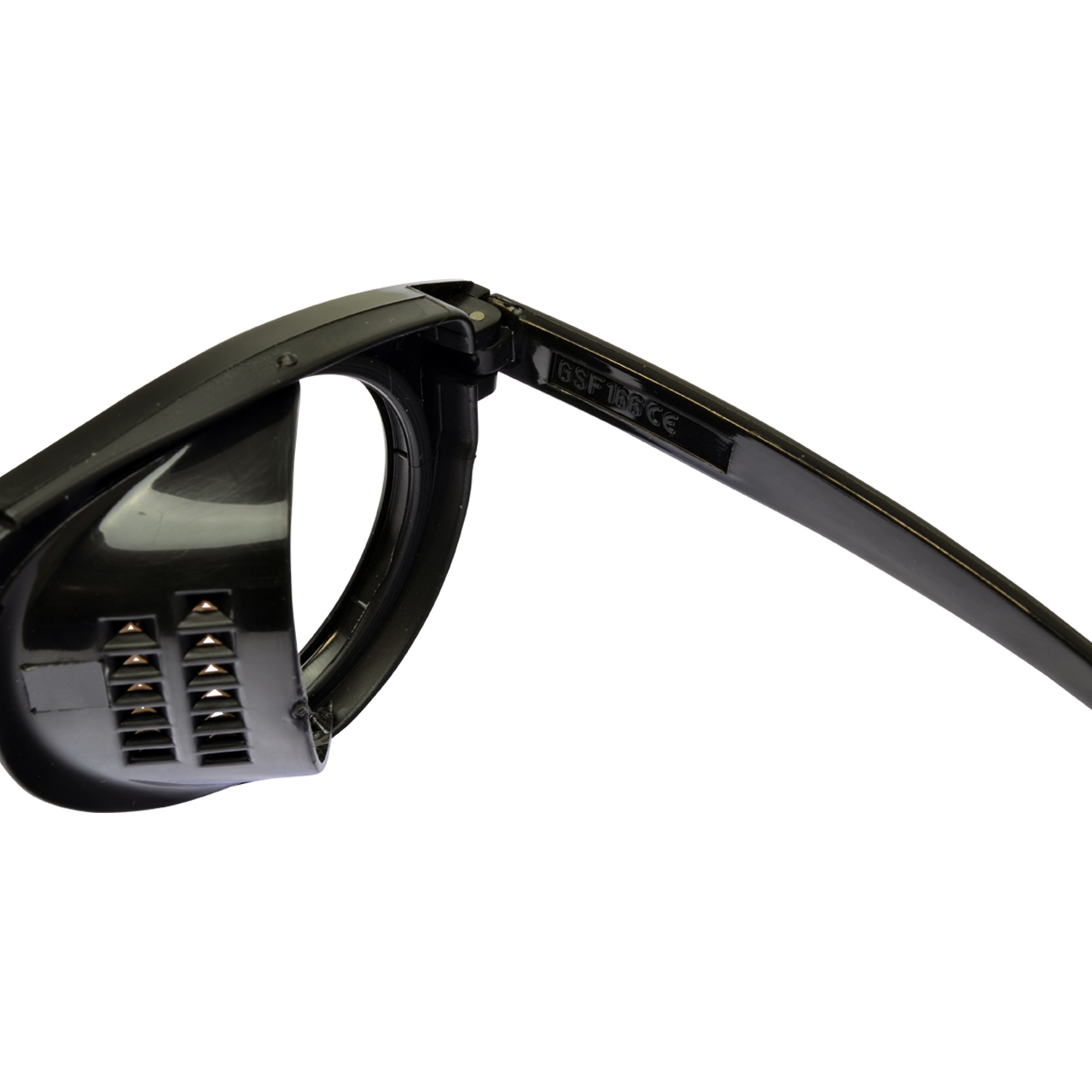 Schutzbrille aus schwarzem Nylon, seitlicher Schutz mit Lüftungsschlitzen, klappbar.